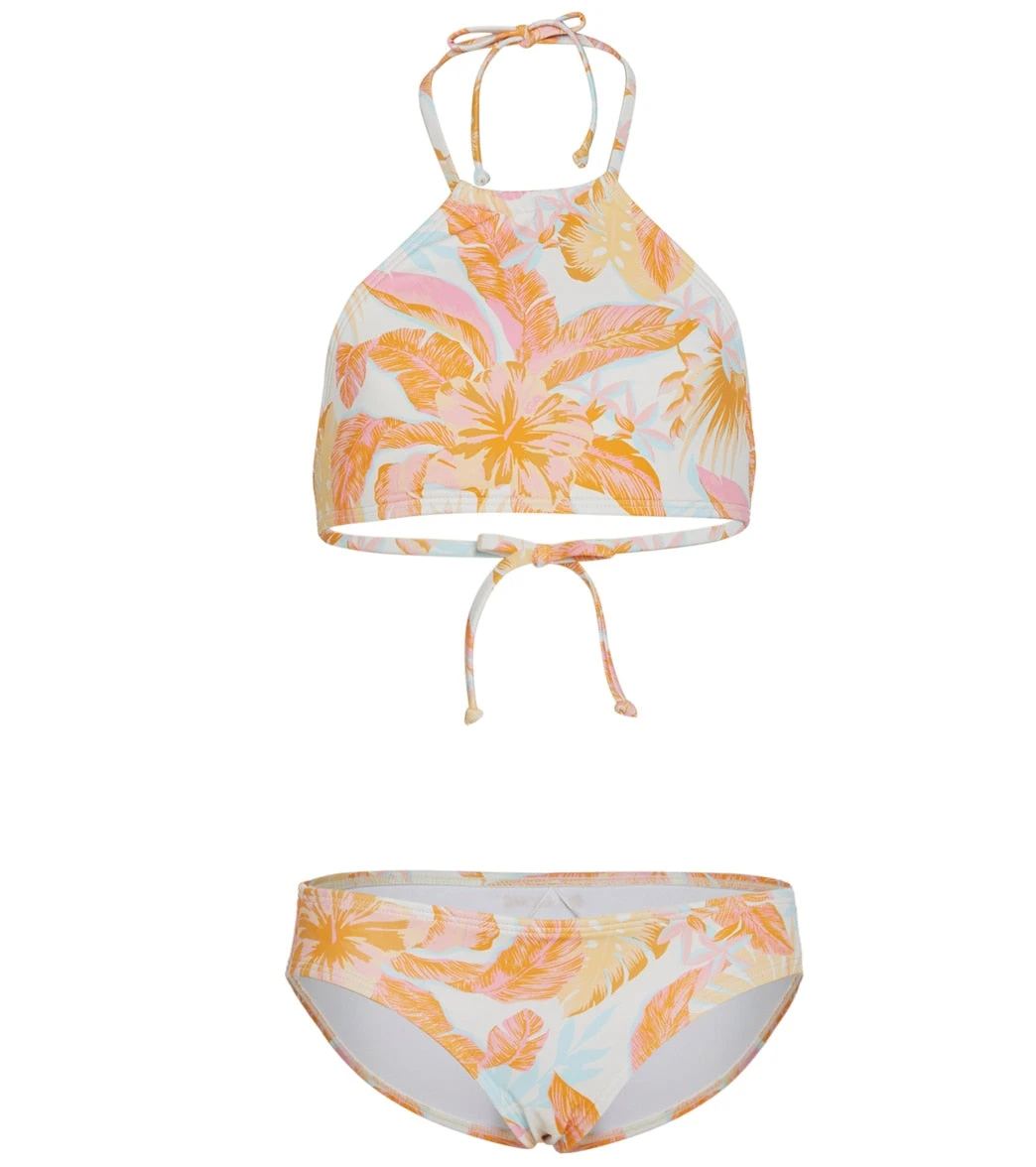 Keep a sunny vibe while wearing the Billabong Girls’ Tropical Punch High Neck Two Piece Bikini Set (Little Kid, Big Kid).