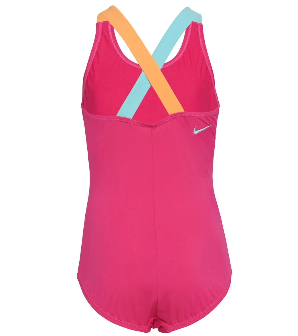 Designed for the young athlete, the Nike Girls’ Reflect Logo Crossback One Piece Swimsuit has ergonomic comfort and enhanced fit, featuring woven elastic to give comfort and flexibility when swimming, while thick straps cross in the back to allow extra freedom of motion.